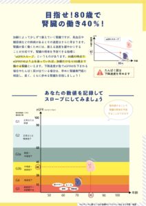 このキャンペーンは、80歳になってもeGFR 40 以上をめざそう!そのためにはeGFRや蛋白尿のチェック、日々の生活に対する注意が必要です!
